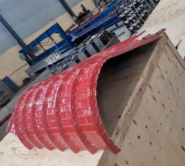เครื่องรีดลอนขนาด 760 มม. พร้อมกับการดัดโค้งเพื่อทำกันสาด เหมาะสำหรับหลังคาเหล็ก เช่น งานบ้าน งานโกดัง และงานโรงรถ เป็นต้น